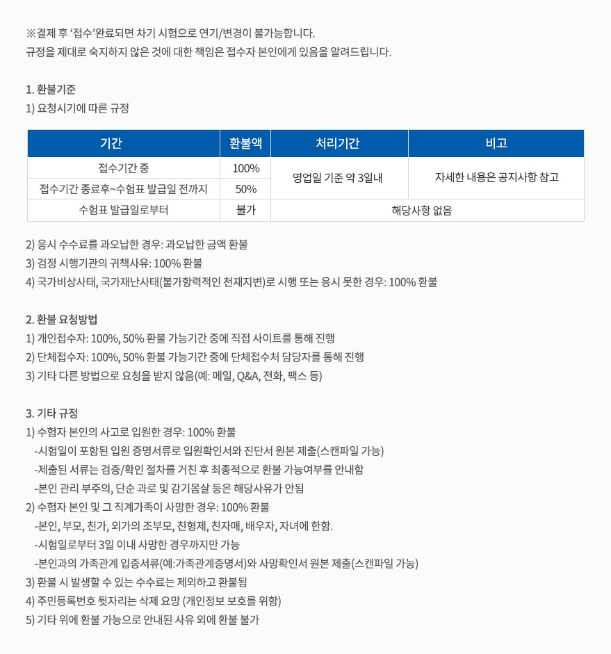 | 자격명 | 시험회차 | 시험구분 | 수험번호 | 고사장 | 접수일 | 취소/환불 |
